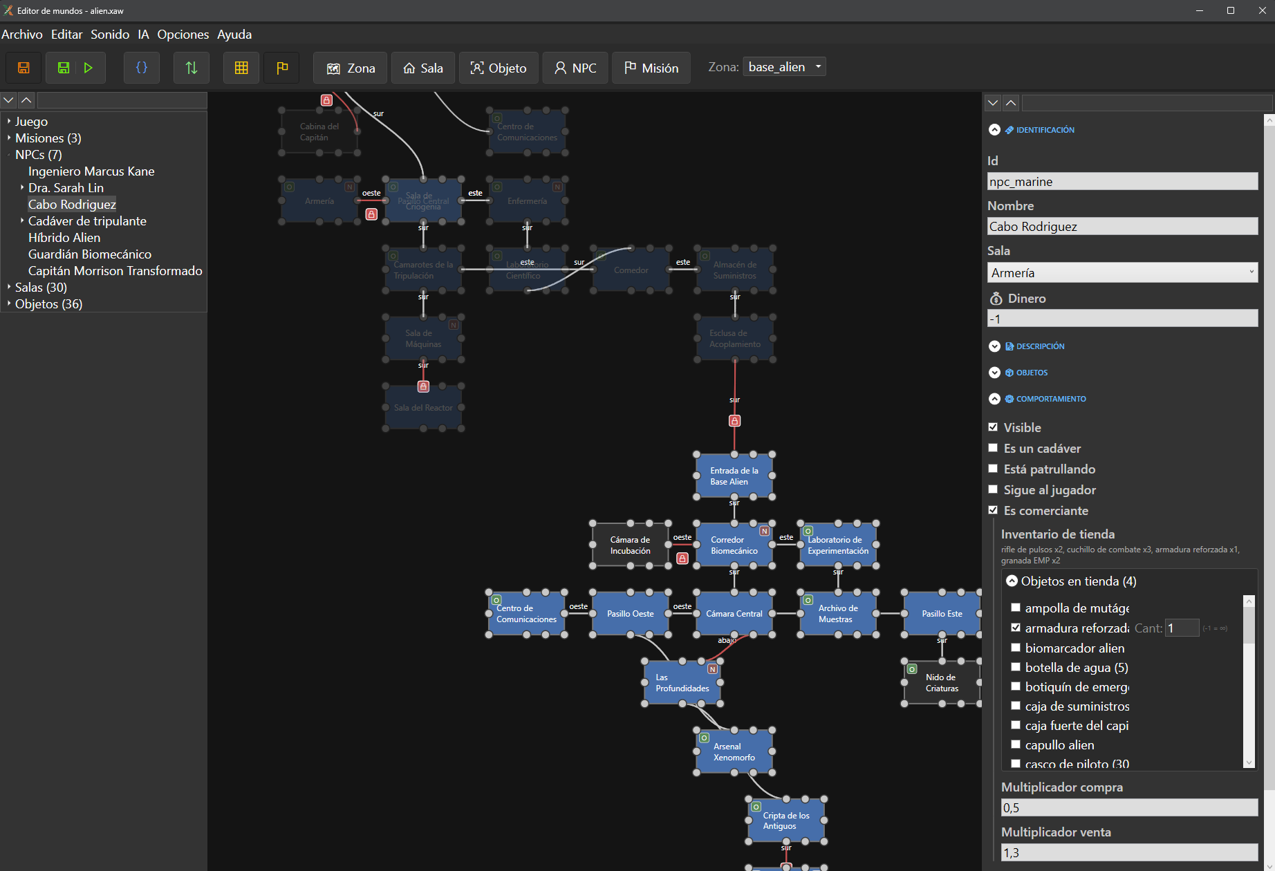 Es una aplicación todo en uno: editor visual de mapas, npcs, objetos, salas, también tiene un editor visual de scripts (tipo blueprints de UnrealEngine) y la idea es que cualquiera pueda hacer una aventura conversacional sin tocar una sola linea de código.