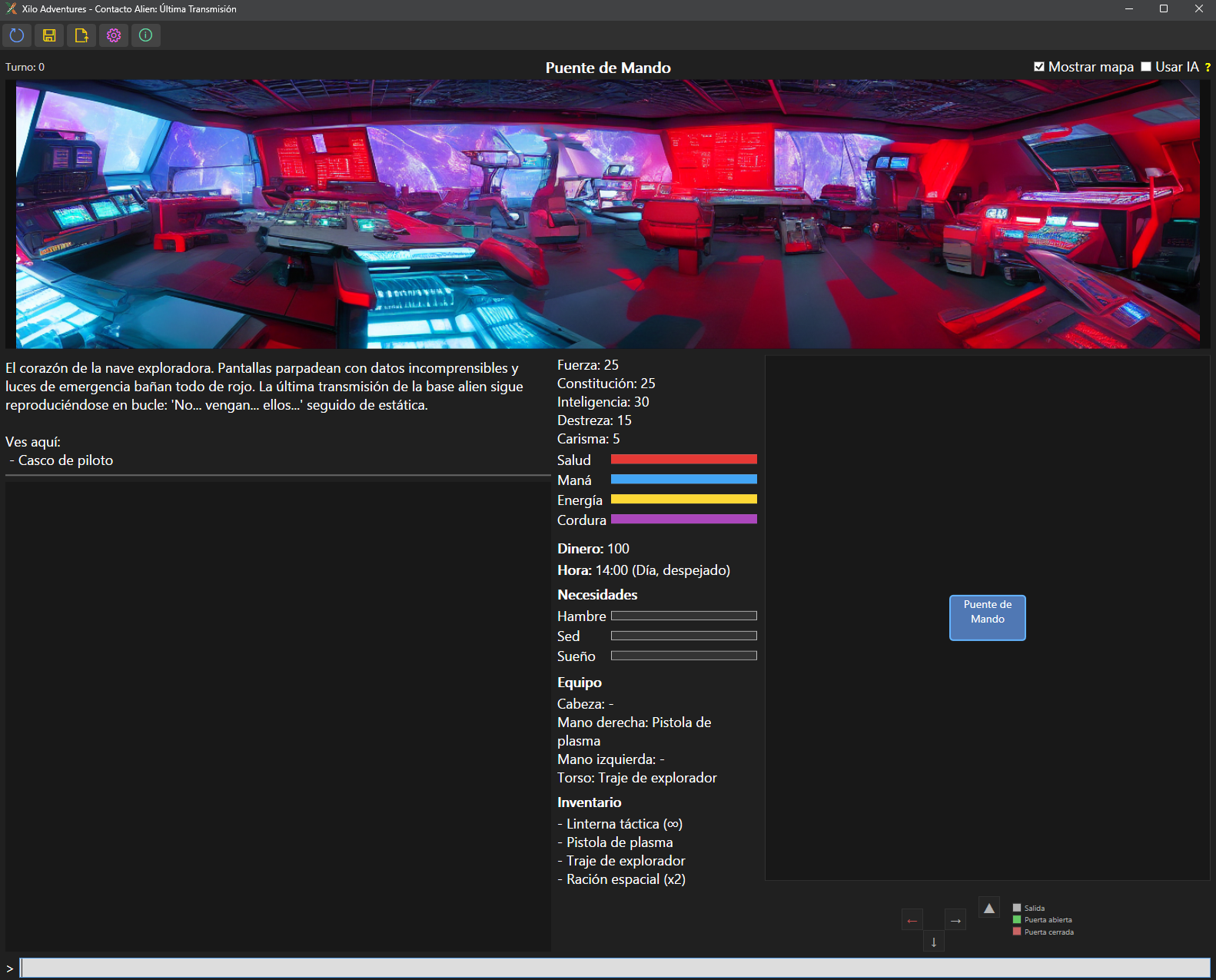 Además del LLM para que entienda al jugador más fácilmente, hay la generación de imágenes automática basada en la descripción de cada sala, y un narrador que lee la descripción de las salas la primera vez que entramos. Todo esto se puede usar o no, eso ya es elección de cada uno. Y se me olvidaba comentar que también genera aventuras completas automáticamente (y es parametrizable) con IA! (lo dicho, IA hasta en los macarrones)